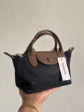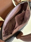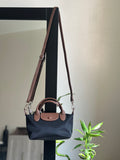 A stylish mini bag designed for everyday use. Features a sleek black body with brown accents, top handle, and adjustable crossbody strap. Lightweight, practical, and easy to match with any outfit.