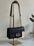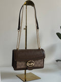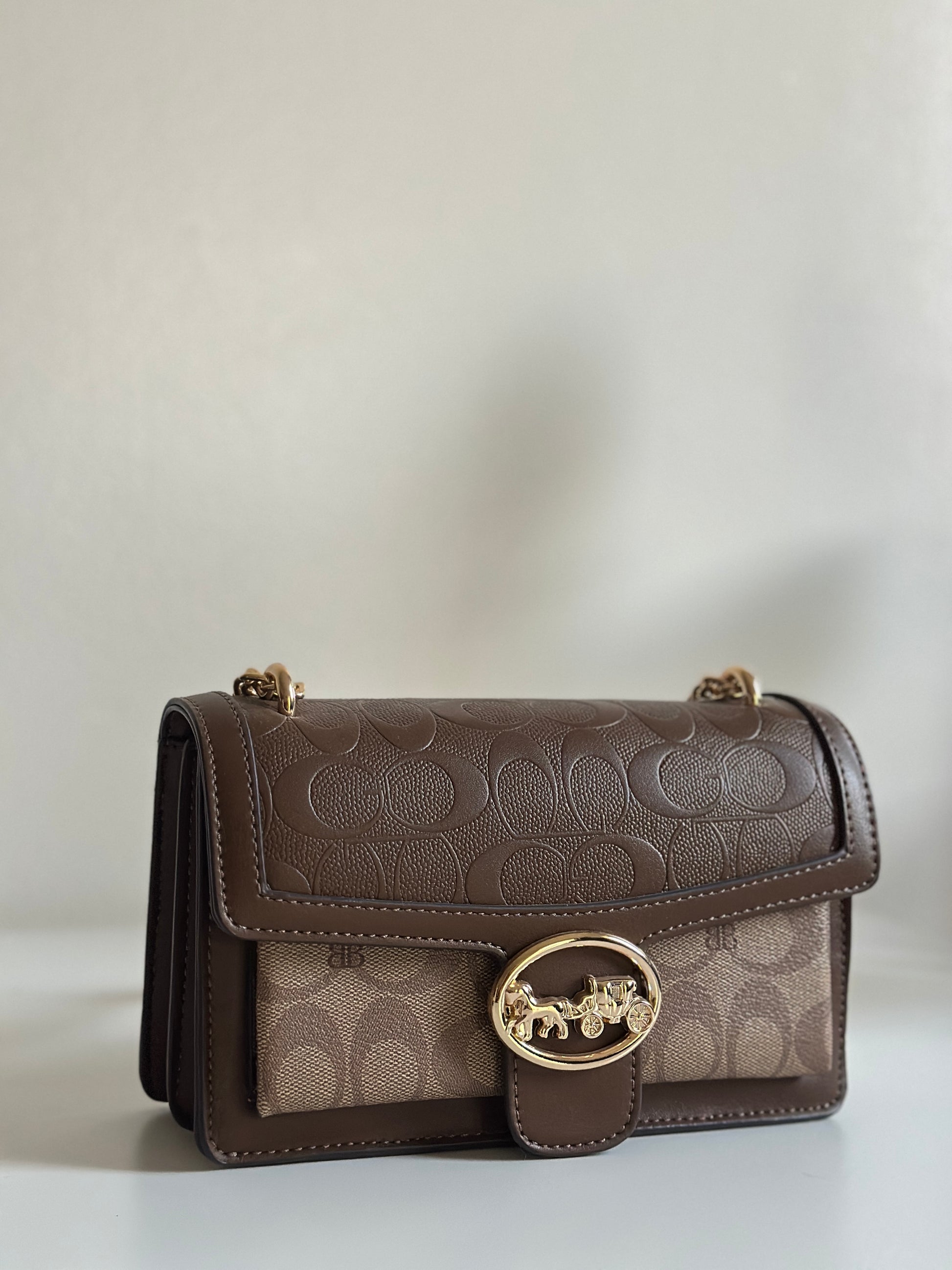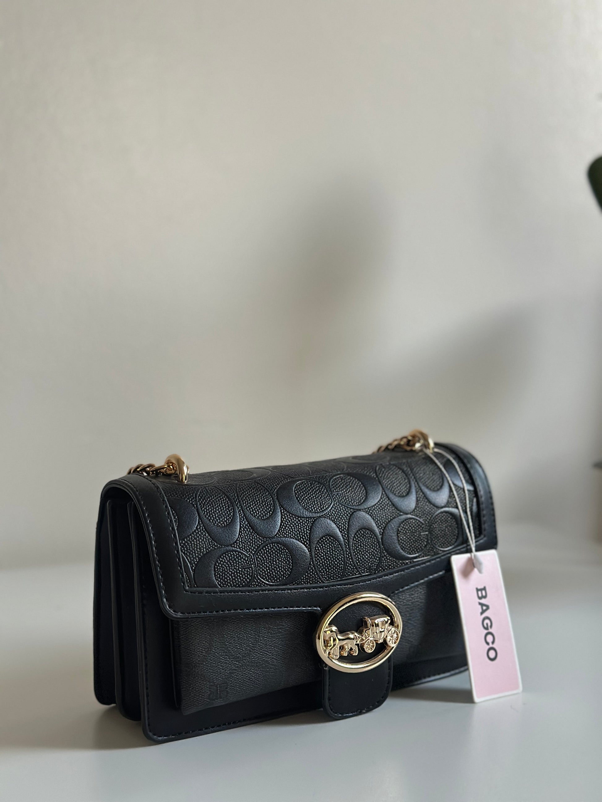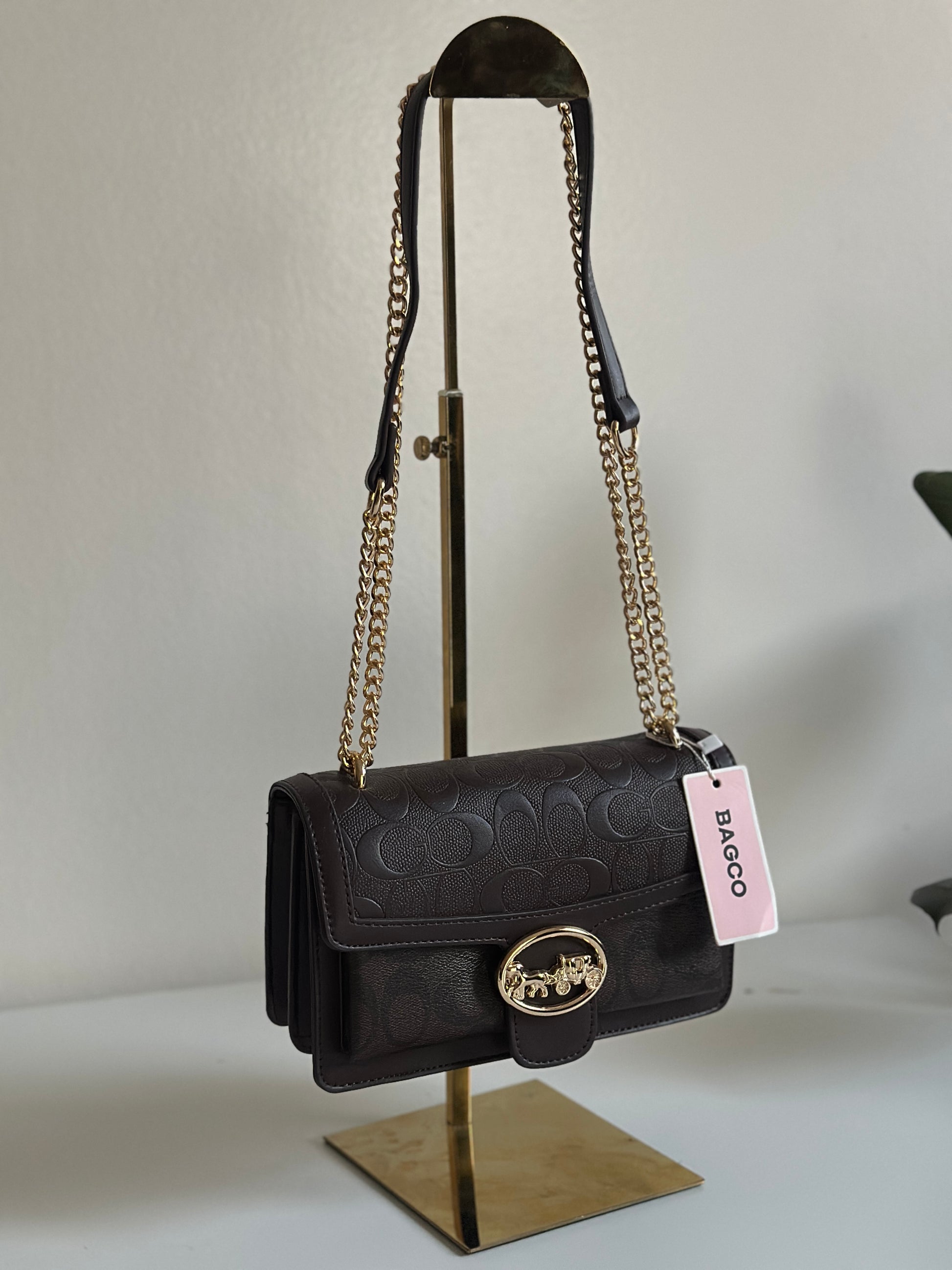 Elevate your style with the BAGCO Signature Chain Shoulder Bag, a chic and versatile piece designed for the modern woman. Featuring a sleek flap closure with a gold-tone horse-and-carriage buckle, this bag blends luxury details with everyday practicality. The embossed monogram pattern adds a refined touch, while the sturdy chain-and-leather strap allows you to wear it comfortably on the shoulder or crossbody.