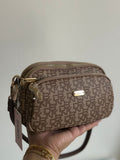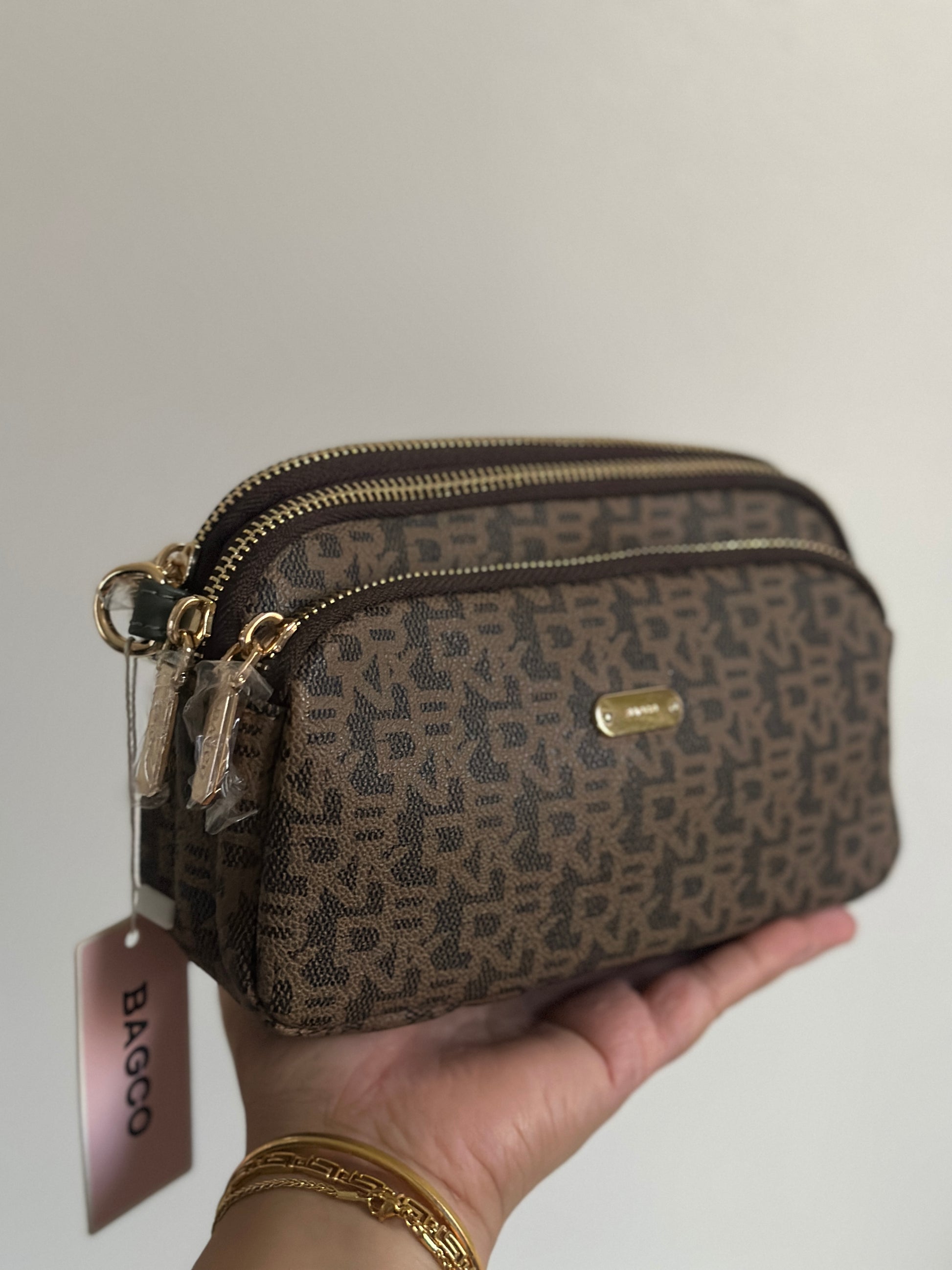 Smart, stylish, and functional — this BAGCO crossbody comes with three zippered compartments, gold hardware, and a chic monogram finish. Perfect for everyday use.
