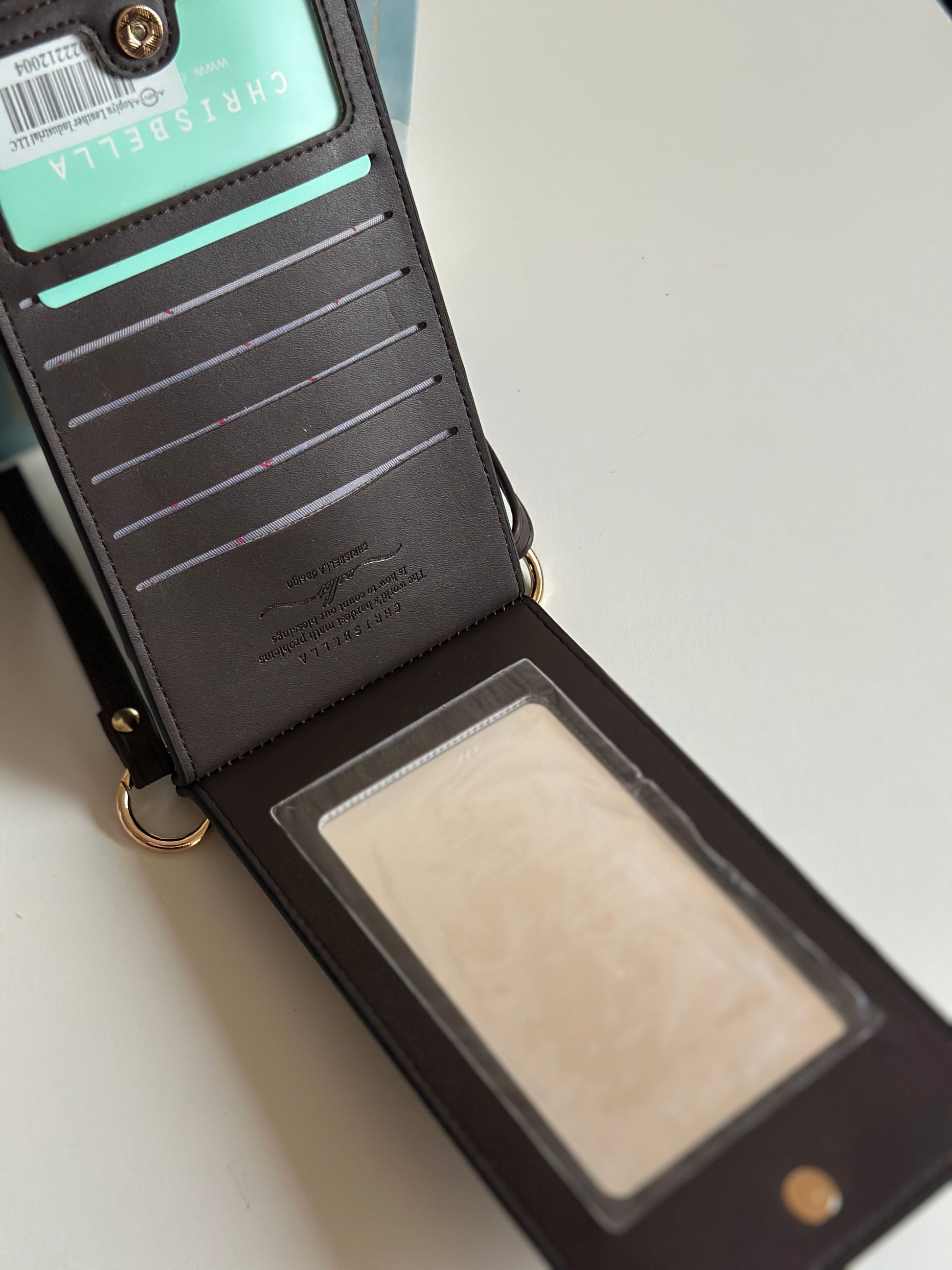 - Compartments: Phone slot, card slots, ID window, zip pocket
