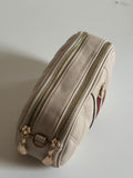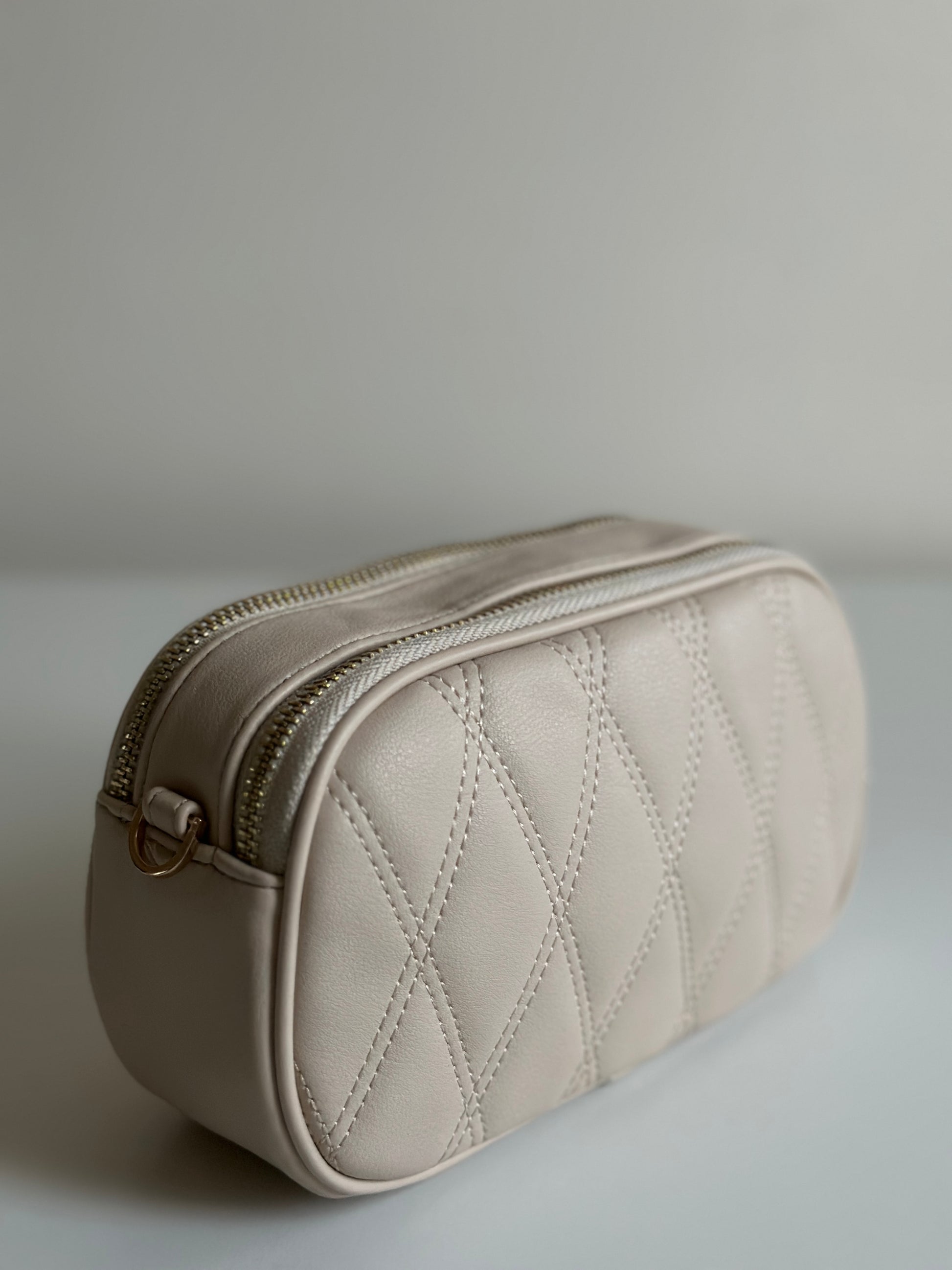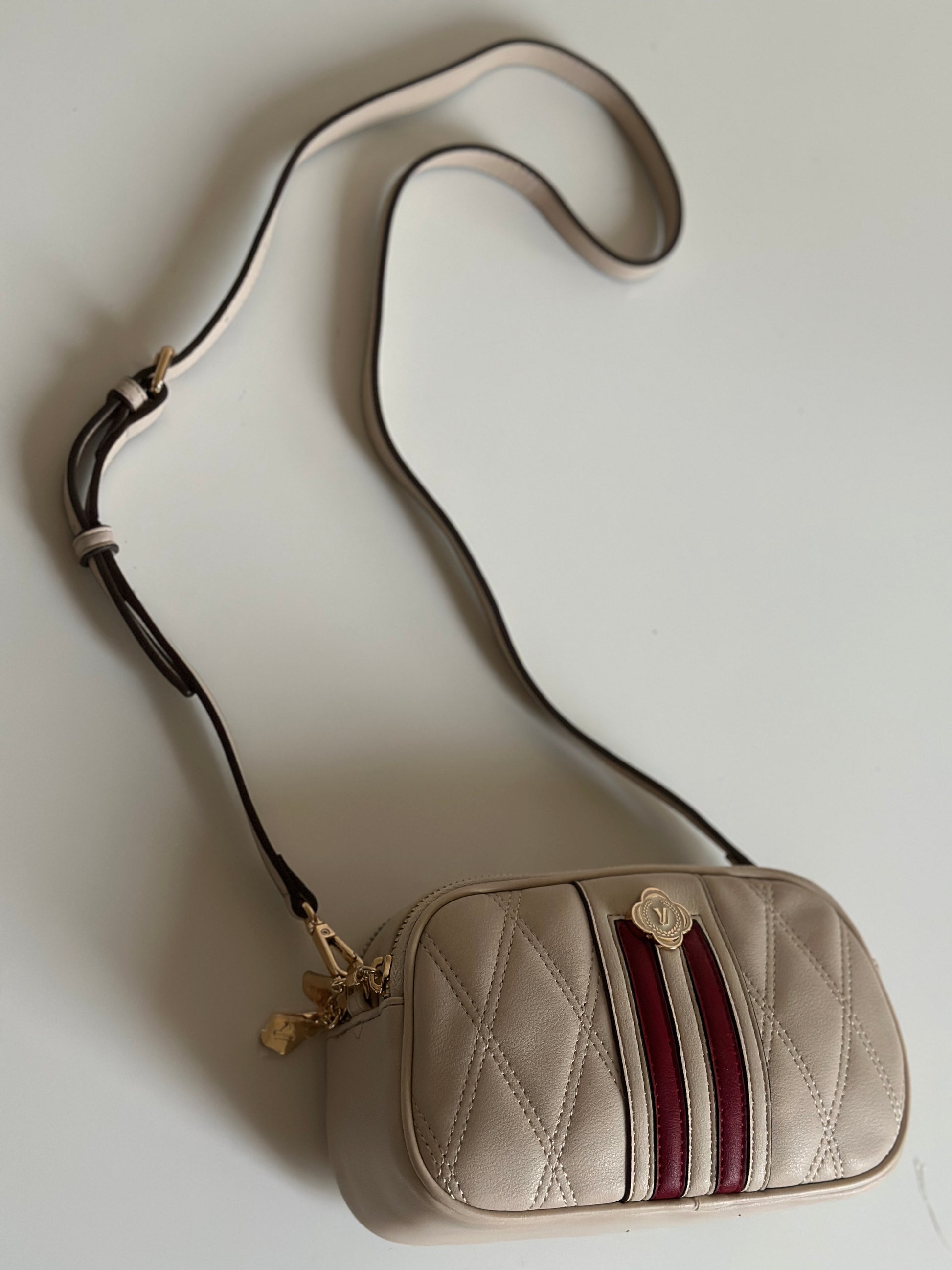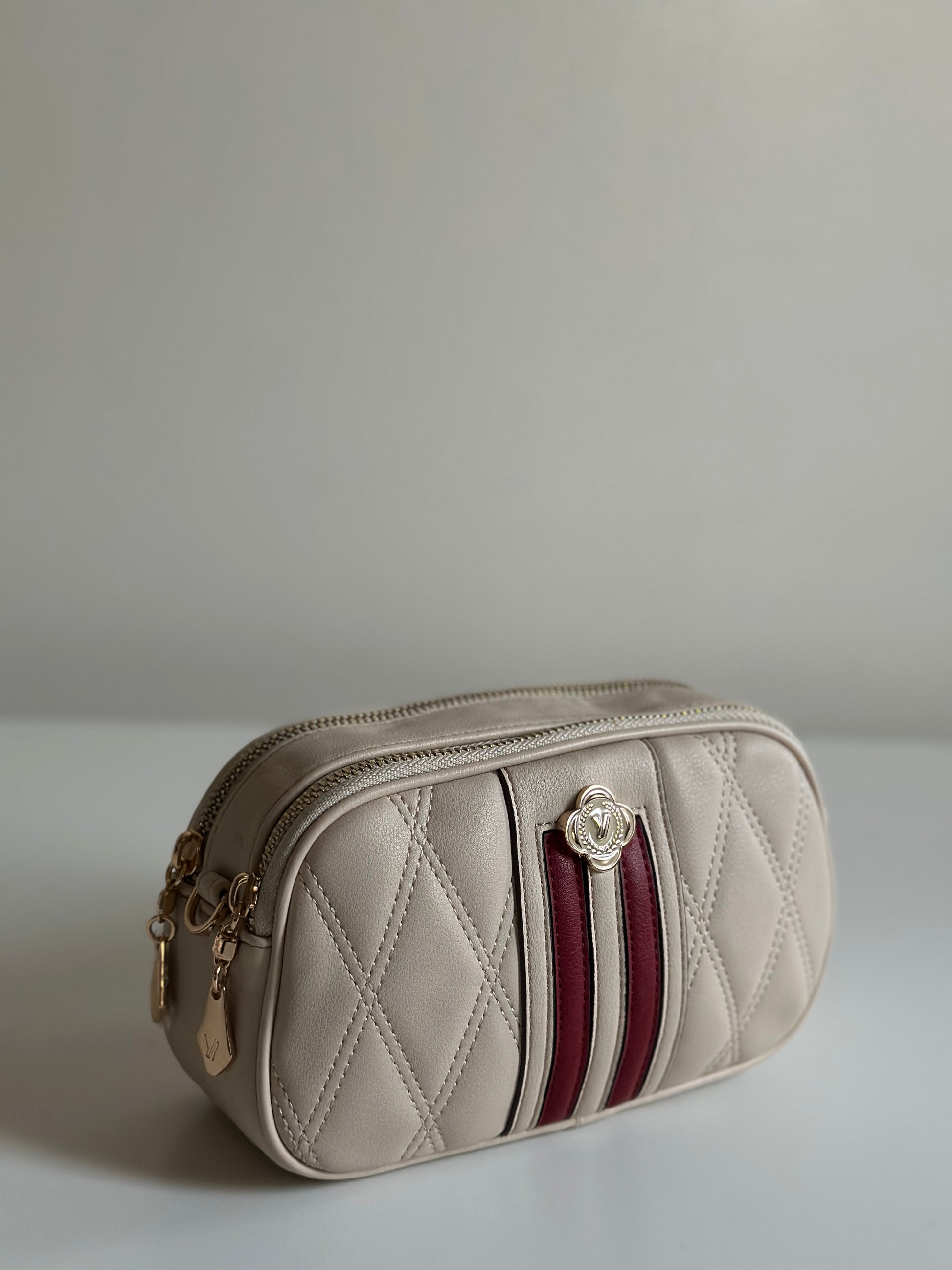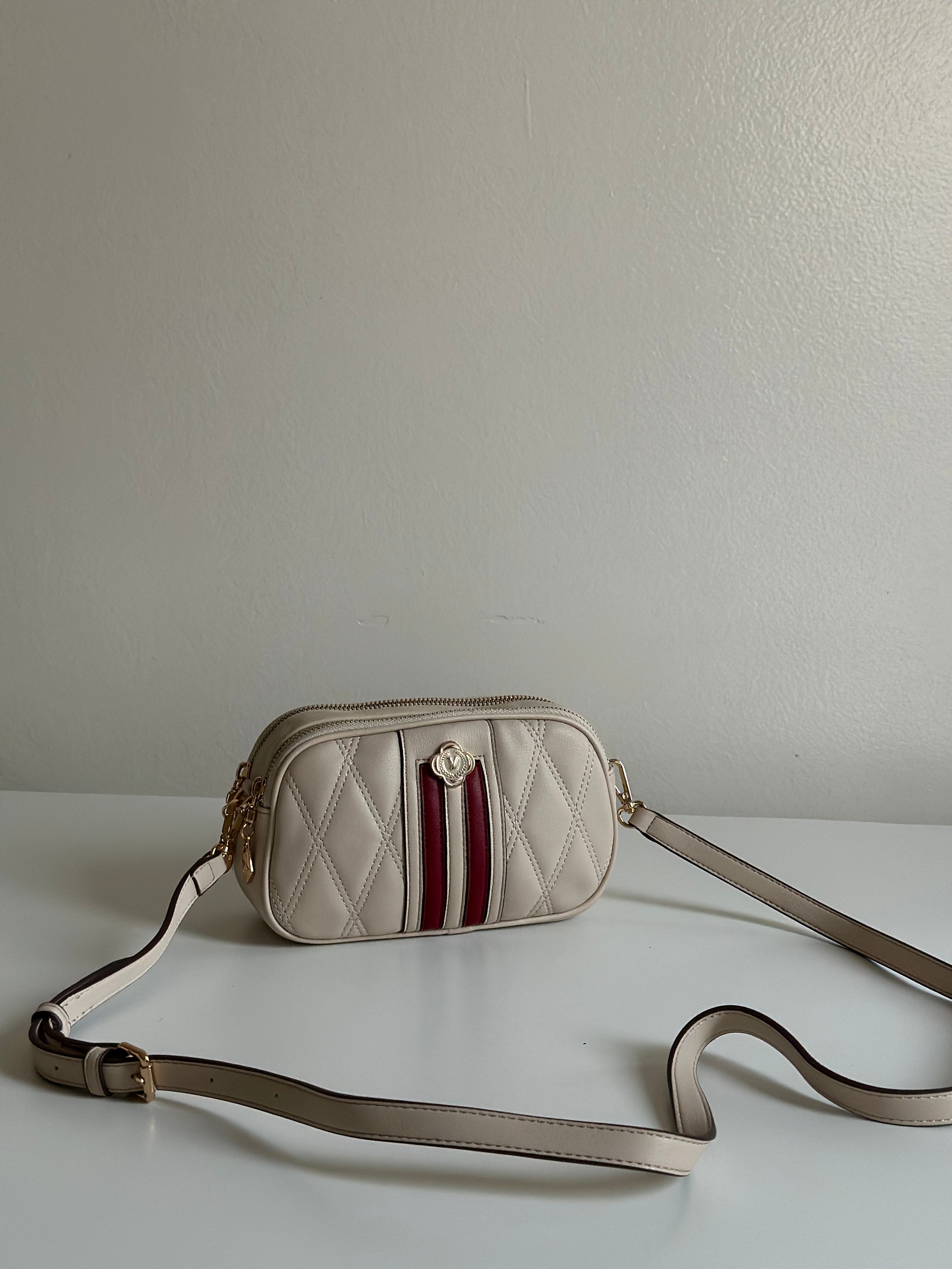 The Quilted Crossbody Bag with Dual Zippers is designed for women who love effortless elegance and functionality. Made with premium beige faux leather, diamond quilted stitching, and highlighted with a striking burgundy stripe, this bag adds sophistication to any outfit.