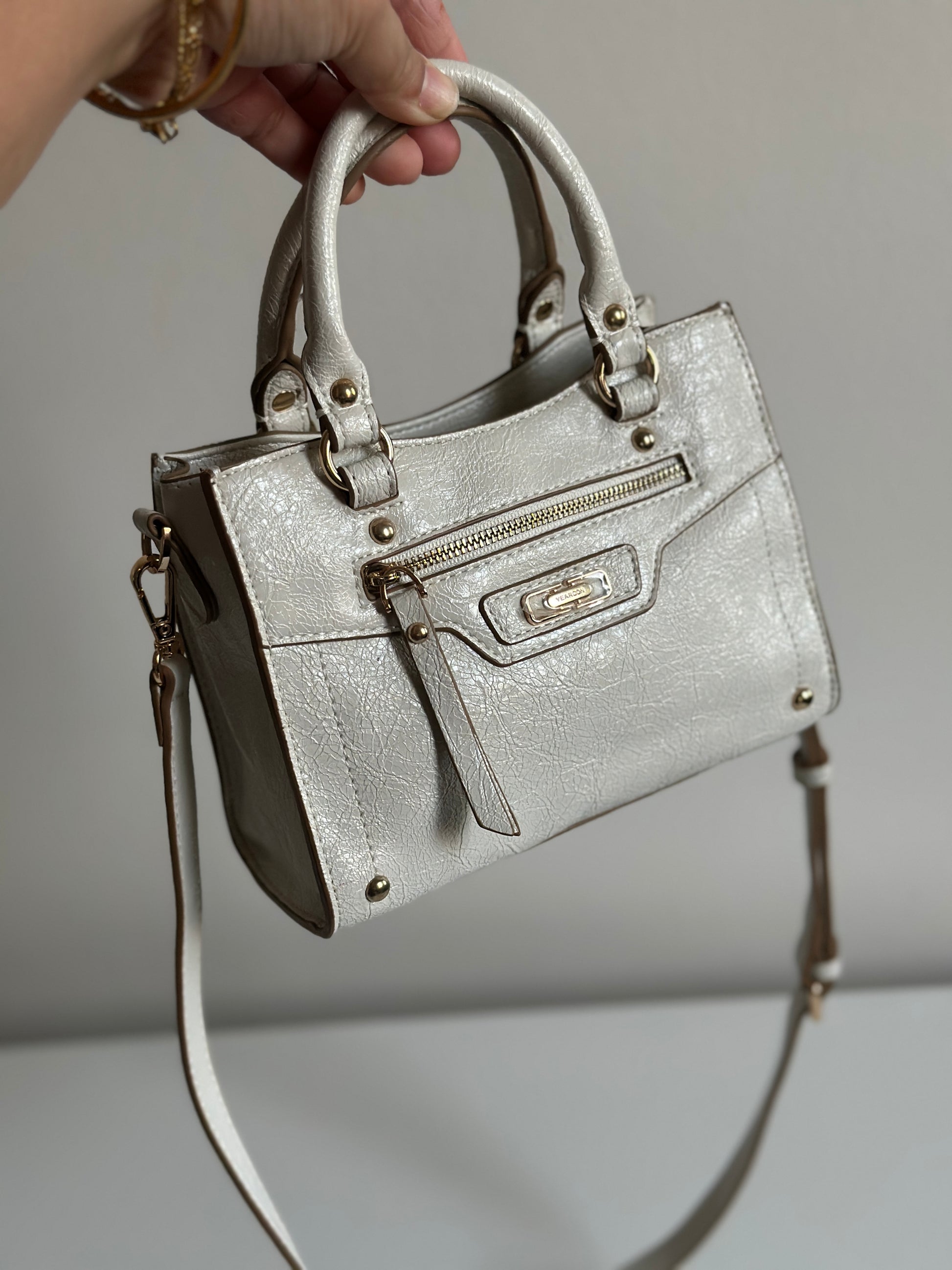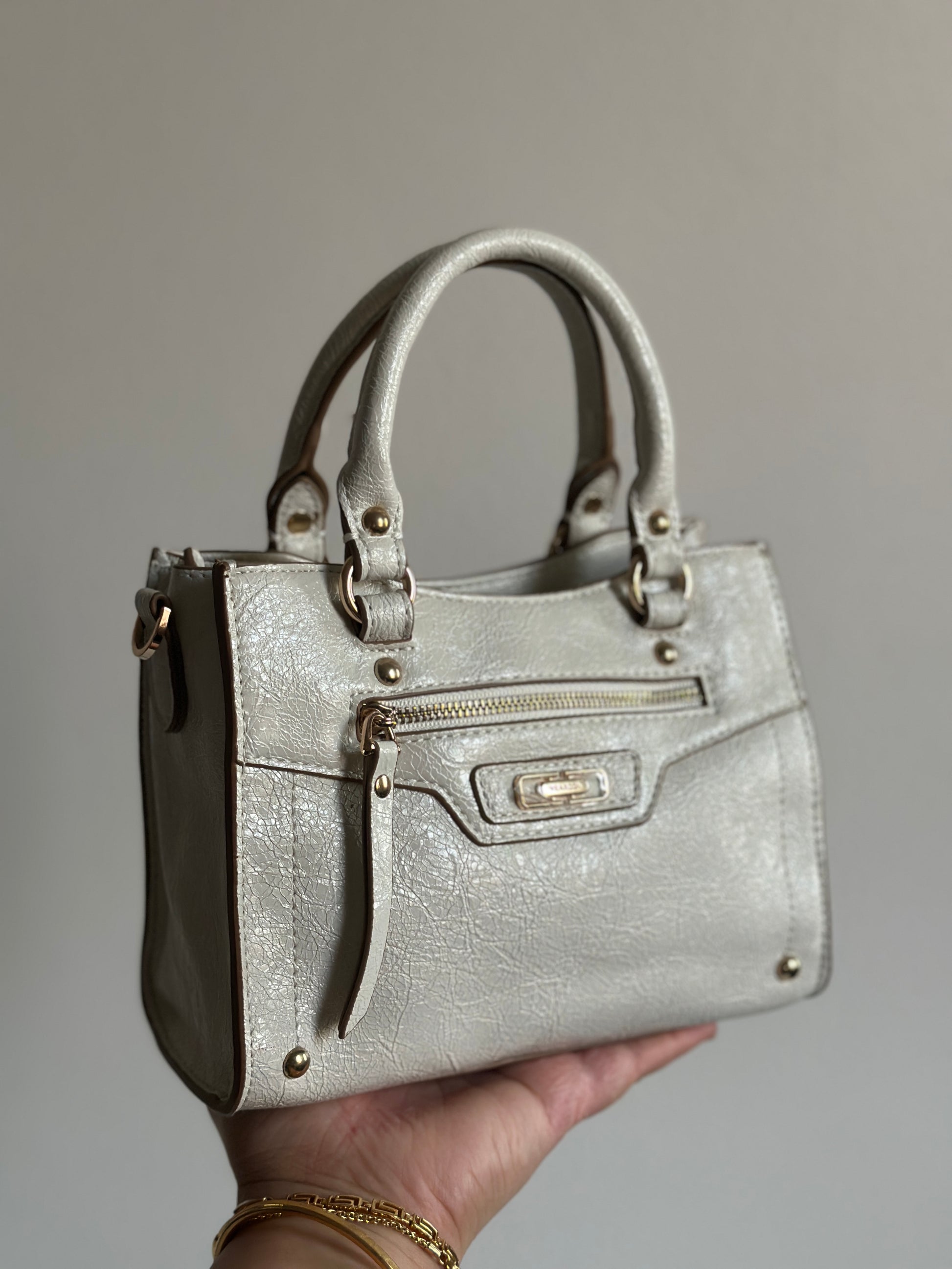 Small Structured Handbag with Front Zipper – Metallic Beige